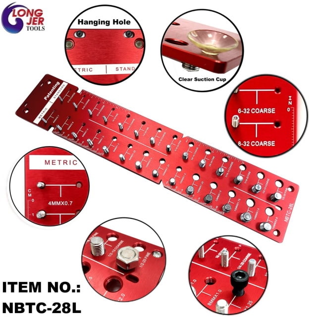 1.) 28 distinct THREAD PITCH sizes, covering Metric thread sizes from M4 x 0.7 to M14 x 2.0 and Imperial threads PITCH from #6 – 32 Coarse to 1/2 – 20 Fine.