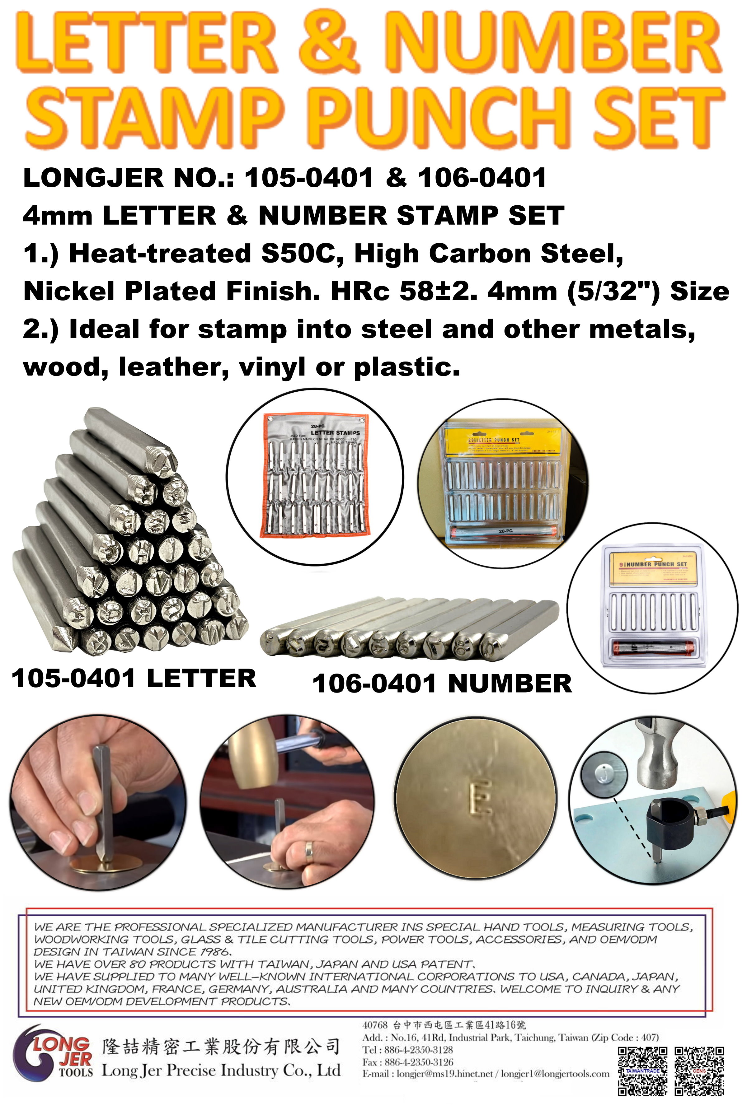 | 105-0401 (Letter Stamp Punch Tools) | High Carbon Steel, Heat-treated S50C, HRc 58±2 | Nickel Plated Finished | Double Blister Card with vinyl pouch bag |